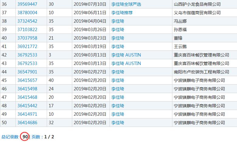 该公司从2019年02月20日开始注册“李佳琦”商标,到目前为止,申请的商标名称包含“李佳琦”、“李佳琦心愿节”、“李佳琦的店”、“李佳琦的小助理”“佳琦严选”、“OMG买它”等等。从商标注册的全面性来看,李佳琦还是非常有知识产权意识的网红主播呀!