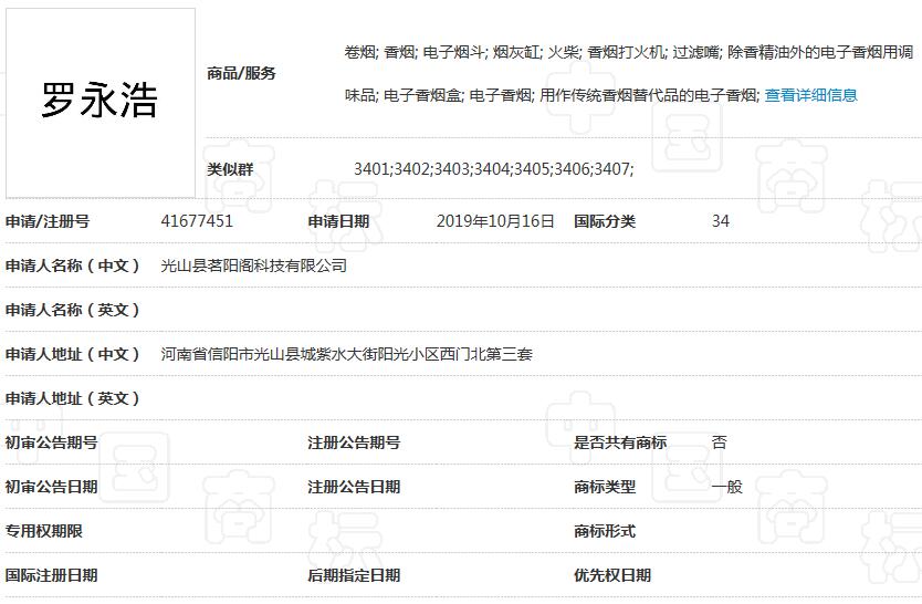 我们最后来看看,老罗的商标布局如何吧?关注老罗的小伙伴应该都注意到,罗永浩的商标在2019年10月就被光山县茗阳阁科技有限公司申请注册了,商标分类为烟草烟具,目前状态为等待实质审查。