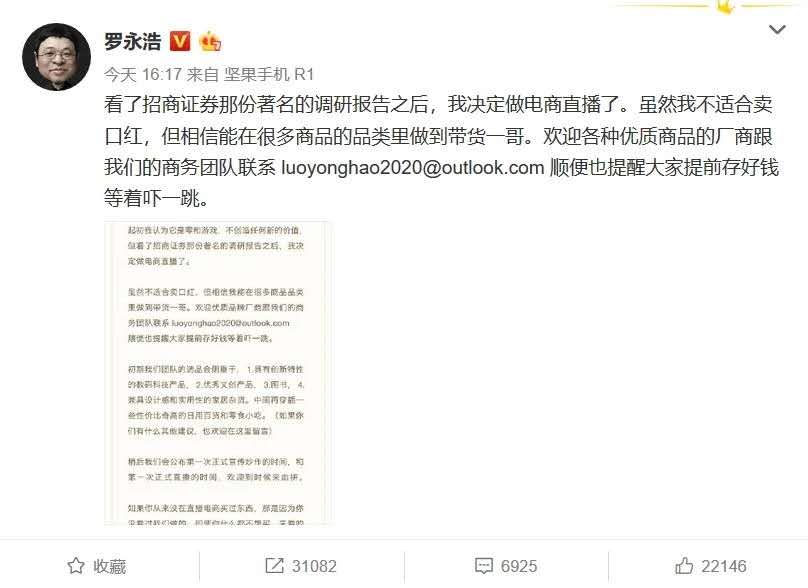 老罗直播早有准备。3月19日,老罗发布微博称:“决定做电商直播,虽然不适合买口红,但相信能在很多商品的品类里做到带货一哥。”如此赤裸裸的挑战,怕是李佳琦的一哥地位不保啊。