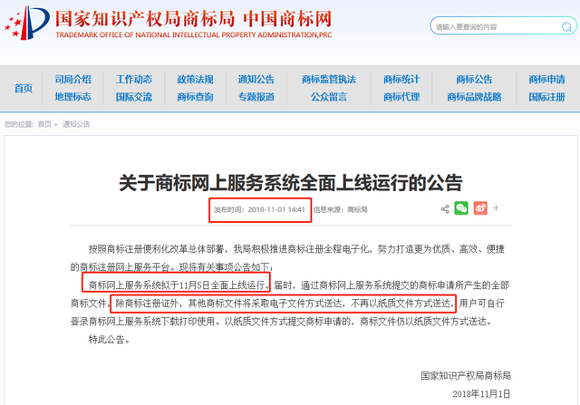 公告中已经提到:商标网上服务系统2018年11月5日全面上线运行。届时,通过商标网上服务系统提交的商标申请所产生的全部商标文件,除商标注册证外,其他商标文件将采取电子文件方式送达,不再以纸质文件方式送达,用户可自行登录商标网上服务系统下载打印使用。以纸质文件方式提交商标申请的,商标文件仍以纸质文件方式送达。
