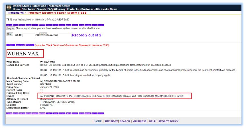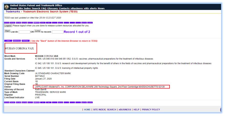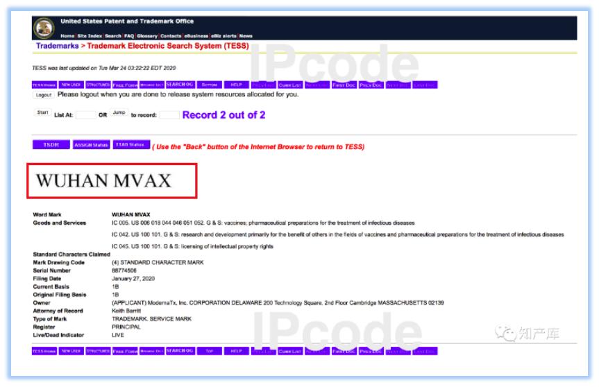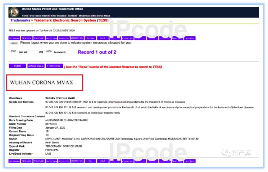 3月25日,中国市场监管报记者从知识产权领域知名自媒体知产库方面了解到,有一家美国生物技术公司Moderna,早在1月27日,便向美国专利商标局(USPTO)申请注册4件商标,指定使用在药品等商品上。