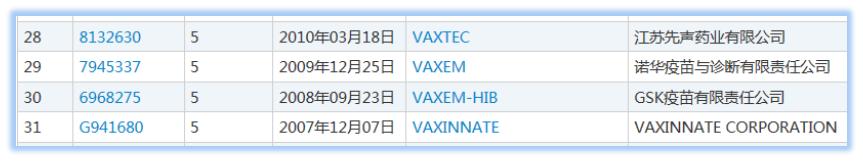 在商标局官方网站查询也可以看到一些带有VAX字样的商标,申请者多为医药公司。